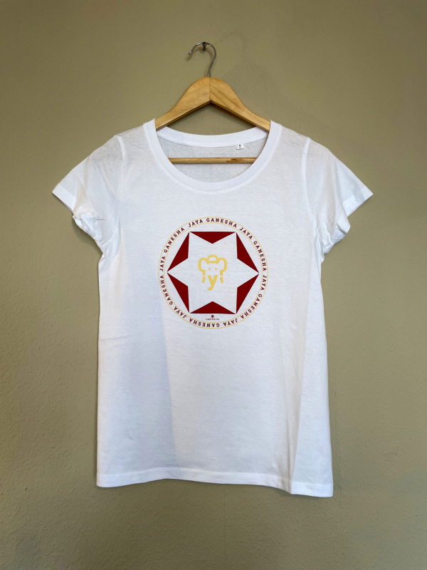 Ein leichtes, bequemes Shirt aus Bio-Baumwolle – für Yoginis und Nicht-Yoginis! Das Design auf der Vorderseite zeigt den Elefantenkopf des Gottes Ganesha, gestaltet aus Buchstaben.