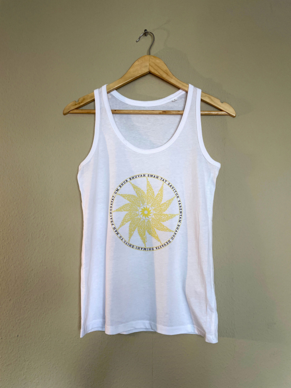 Ein leichtes, anliegendes Shirt aus Bio-Baumwolle – für Yoginis und Nicht-Yoginis! Das sommerliche Leichtgewicht trägt auf der Vorderseite ein „Typo-Mantra“. Dieses besteht aus den Buchstaben des großen Gayatri-Mantras, eines der bekanntesten Mantras, einem mystischen Gruß an die Sonne: