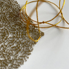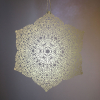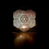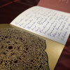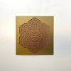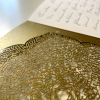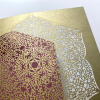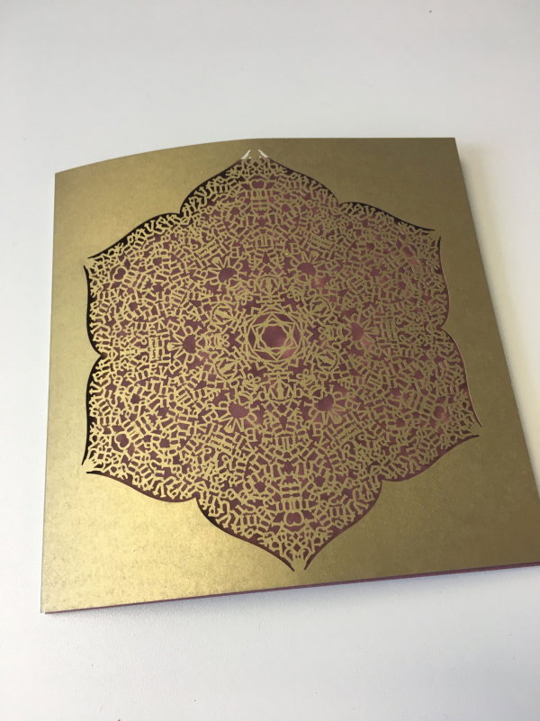 Klappkarte aus Naturkarton, quadratisch. Gold- und Brombeerfarben. Verwendbar als Glückwunschkarte, Windlicht oder zum Aufhängen. Vorderseite mit filigraner Laserstanzung, bestehend aus den Buchstaben des Mantras „Om Tryambakam“.