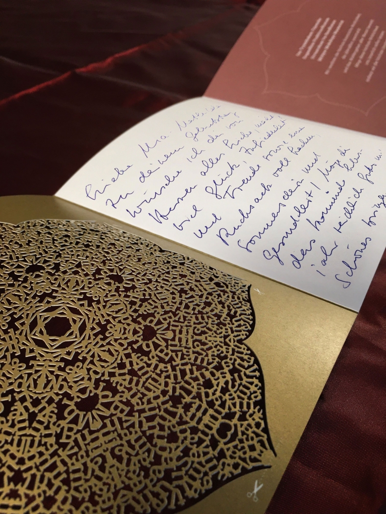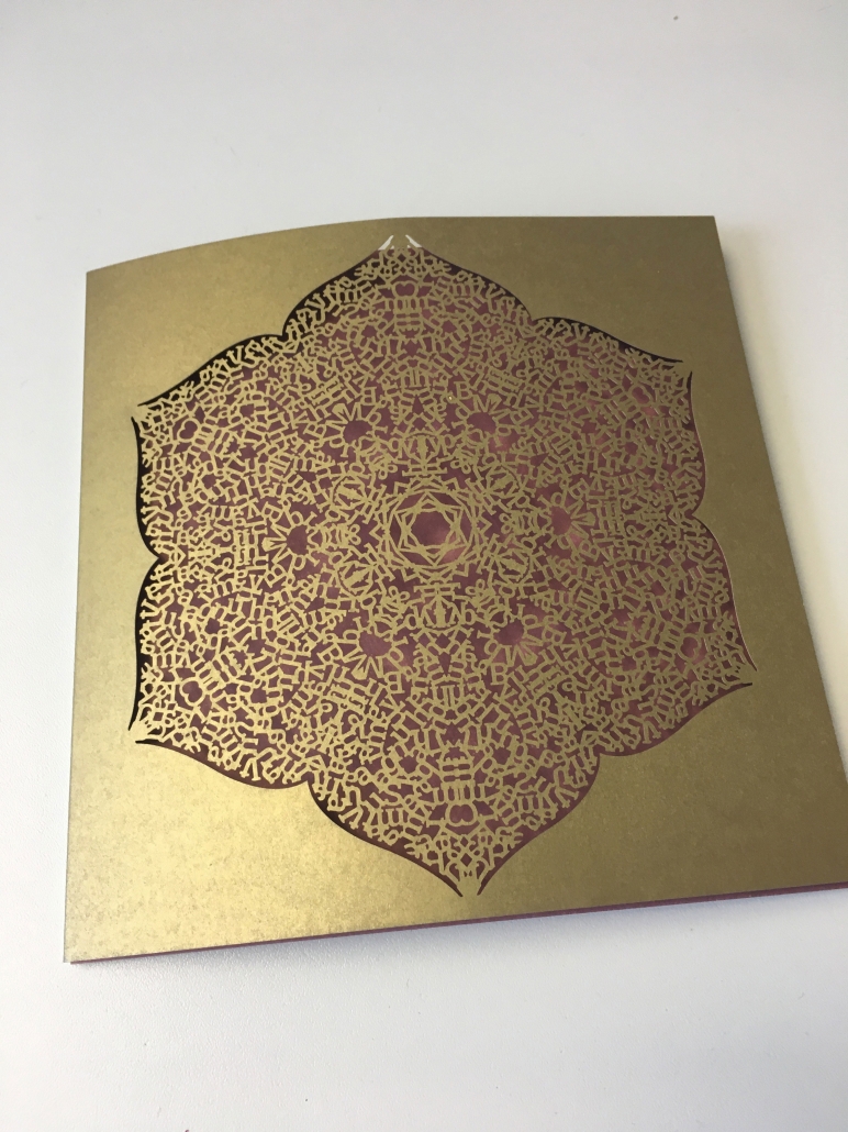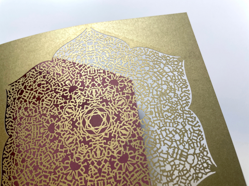 Das besondere an dieser Karte: Die Vorderseite der Karte besteht aus einer filigranen Laserstanzung und enthält ein sogenanntes „Typo-Mantra“.  Dieses besteht aus den Buchstaben des Mantras „Om Tryambakam“. Es ist ein altes vedisches Mantra, das u. a. für das eigene oder für das Wohlergehen anderer rezitiert wird. Siehst du die Buchstaben?