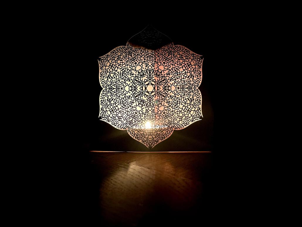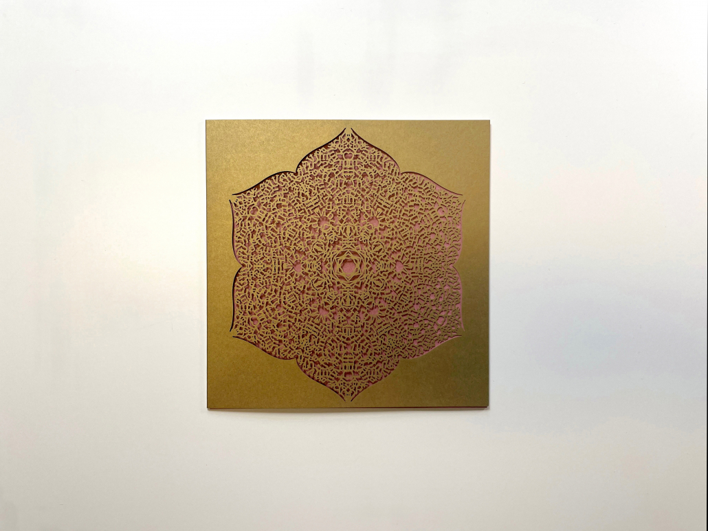 Klappkarte aus Naturkarton, quadratisch. Gold- und Brombeerfarben. Verwendbar als Glückwunschkarte, Windlicht oder zum Aufhängen. Vorderseite mit filigraner Laserstanzung, bestehend aus den Buchstaben des Mantras „Om Tryambakam“.