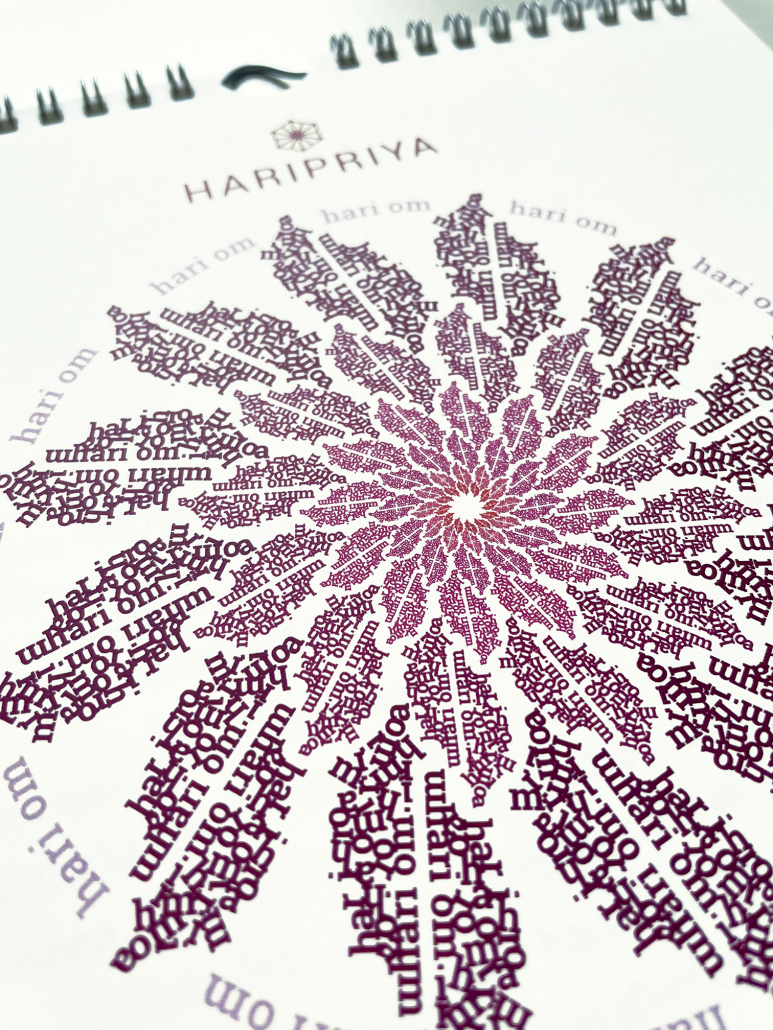 Der Haripriya Kalender 2025 vereint kunstvolle Typo-Mantras und Affirmationen in mandalaartigen Designs, die Monat für Monat zu Achtsamkeit und Meditation inspirieren.